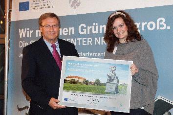 NRW-Wirtschaftsminister Garrelt Duin (r.) übergibt Landrat Dr. Klaus Effing und WESt-Geschäftsführerin Birgit Neyer den Zuwendungsbescheid. Foto: MWEIMH/R.Pfeil