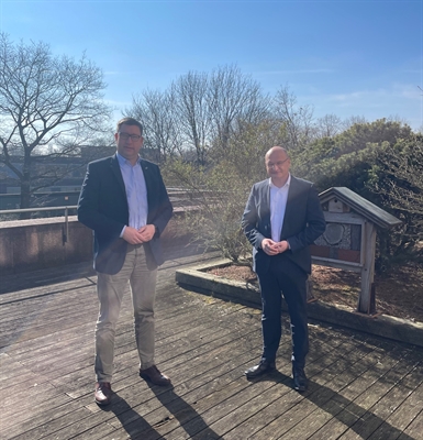Dr. Martin Sommer (r.), kommissarischer Landrat des Kreises Steinfurt, und Dr. Jürgen Vutz (l.), Vorstandsvorsitzender von Windmöller & Hölscher, freuten sich über den Austausch.