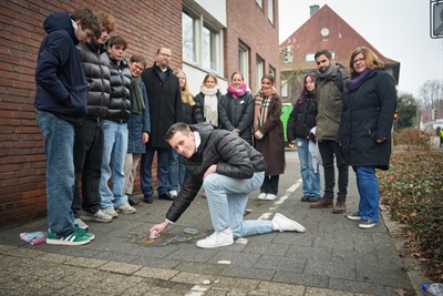 Gemeinsam reinigen Schülerinnen und Schüler des St.-Georg-Gymnasiums die Stolpersteine von Max und Paul Hochheimer an der Weberstraße.