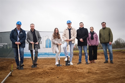 Für Familie Heßling geht es jetzt auf ihrem Grundstück in Mussum richtig los. Zum ersten Spatenstich gratulierten neben Stadtbaurat Dave Welling (3. von rechts) auch (von links) Ralf Hagedorn (Hochbau Hagedorn), Architekt Daniel Ritte sowie (von rechts) Ingo Strohfeld und Isabell Rosengärtner vom Fachbereich Grundstücks und Bodenwirtschaft der Stadt Bocholt.