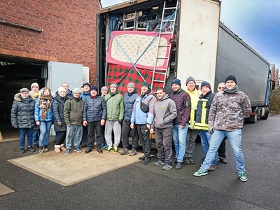118 Feuerlöscher, 10 Generatoren, Schulmöbel, Winterkleidung, Betten, medizinische Versorgung – verpackt und verladen mit Unterstützung ukrainischer und syrischer Geflüchteter