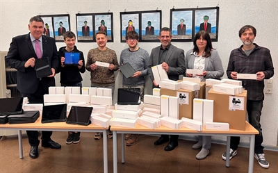 Projektkoordinatorin Anja Hohrath, Kreisdirektor Rainer Stratmann und der Leiter des Hellweg-Berufskollegs Bernd Marreck (vorne, 4. bis 6. v.l.) im Kreise der angehenden Fachinformatiker und IT-Systemelektroniker und ihren Projektbetreuern.