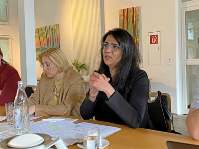Miriam Palazzi (MKJFGFI) und Şengül Ersan (Fachbereichsleiterin Zuwanderung und Integration) im Gespräch mit dem KIM Lenkungskreis. Foto: Katja Arens – Kreis Unna