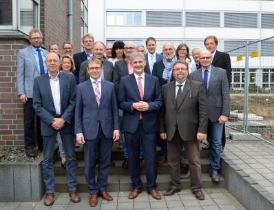 Projektkoordinatorin Anja Hohrath, Kreisdirektor Rainer Stratmann und der Leiter des Hellweg-Berufskollegs Bernd Marreck (vorne, 4. bis 6. v.l.) im Kreise der angehenden Fachinformatiker und IT-Systemelektroniker und ihren Projektbetreuern.
