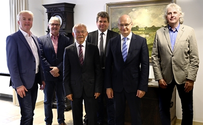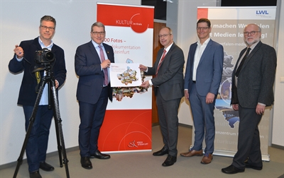 Die Motivliste ist überreicht, die Arbeit kann beginnen - über die Kooperation zwischen Kreis Steinfurt und LWL freuen sich (v. l.): Stephan Sagurna, Fotografenmeister LWL-Medienzentrum für Westfalen, Landrat Dr. Klaus Effing, LWL-Direktor Matthias Löb, Kreis-Dezernent Tilman Fuchs, Dr. Hermann-Josef Höper, Produktionsleiter LWL-Medienzentrum für Westfalen.