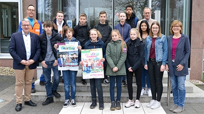 Freuen sich gemeinsam auf die Aktion „Grüne Meilen“: Lorenz Blume (Klimaschutzmanager Stadt Steinfurt), Jan Kern und Dagmar Fischer-Moeltgen (beide BNE-Regionalzentrum des Kreises Steinfurt), Landrat Dr. Klaus Effing sowie die Lehrerinnen Sandra Timmers (Bismarck-Schule) und Simone Große Burlage (Graf-Ludwig-Schule) mit ihren Schülerinnen und Schülern.