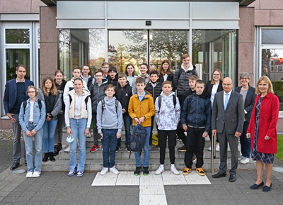 Freuten sich über das große Interesse an Berufen in der Kreisverwaltung: Landrat Dr. Martin Sommer, stellv. Haupt- und Personalamtsleiter Christian Ernst (l.), die Gleichstellungsbeauftragte Brigitte Kumpmann (2. Reihe r.) und Organisatorin des Girls‘ und Boys‘ Day Anna Naber (2. Reihe, 2. V. r.) und stellvertretend für die Mentorinnen und Mentoren, Silke Wesselmann, Leiterin des Amtes für Klimaschutz und Nachhaltigkeit.