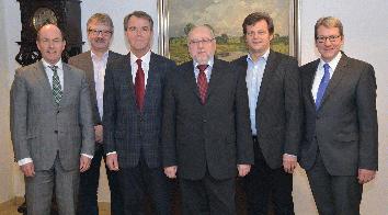 Arbeiten Hand in Hand im zivil-militärischen Bereich zusammen (v. l.): Kommandeur Landeskommando Nordrhein-Westfalen Oberst Jürgen Bergmann, Landrat Thomas Kubendorff, Stellvertreter des Generalinspekteurs der Bundeswehr Vizeadmiral Wolfram Kühn, Kreisordnungsdezernent Dr. Martin Sommer und der Leiter Kreisverbindungskommando Steinfurt, Oberstleutnant Bernd Lange.