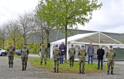 Landrat Dr. Martin Sommer (2.v.r) verabschiedete gemeinsam mit Dr. Karlheinz Fuchs (3.v.r.), Leiter der Stabsstelle Corona und designierter Dezernent für Gesundheit und Bevölkerungsschutz, und im Beisein von Oberfeldärztin Dr. Mascha-Christine Groß, Kommandeurin des Sanitätsregimentes 4 in Rheine (2.v.l.), die in Ibbenbüren eingesetzten Soldatinnen und Soldaten (Oberstabsgefreiter Christian Menningmann, 3.v.l., Hauptgefreite Kathrin Bibelnik, 4.v.l., Oberstabsfeldwebel Achim Rist, 6.v.l., Hauptgefreiter Jaimy Gaschler, 7.v.l., und Obergefreiter Leonard Wenners, r.). Bei der Verabschiedung dabei waren auch der Leiter des Kreisverbindungskommandos Steinfurt, Oberstleutnant Bernd Lange (l.), und Helmut Eierhoff vom Kreis Steinfurt (5.v.l.), der den Abstrich-Container von der Verwaltungsseite des Kreises her lange Zeit betreute. Foto: Dorothea Böing / Kreis Steinfurt