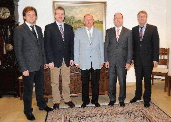 Die Steinfurter Delegation überreicht die „Münsterland-Botschaft“ an den Ministerpräsidenten (v. l. n. r.): Dr. Rolf Hennings, Günter Borowski, Landrat Sigfried Konieczny (Demmin), Ministerpräsident Erwin Sellering (Mecklenburg-Vorpommern), Ulrich Oletti, Ferdinand Sendes.