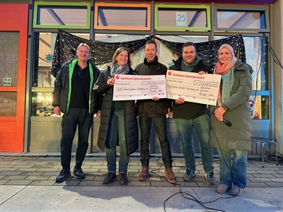 Freuen sich über einen Scheck über 2.000 Euro aus den Händen von Bürgermeister Frank Helmenstein: Wiebke Meyer (Vorsitzende der Fachschaft Geschichte am Städtischen Lindengymnasium) und Sigrid Höffken (stelllvertretende Schulleiterin) und Schüler:innen des SLG. Das Geld wird zur Unterstützung einer Gedenkstätten-Fahrt in Gummersbachs Partnerstadt Burg verwendet, die das SLG im Rahmen einer Projektwoche im Juli des kommenden Jahres unternehmen wird.