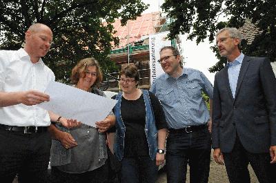 Architekt Jens Matzken (links) erklärt Monika Haverkamp vom Bürgerverin, dem Ehepaar Ute und Holger Büning sowie Stadtbaurat Ulrich Paßlick die vorgesehenen Maßnahmen der Altbausanierung des Musterhauses. (Foto: Bruno Wansing, Stadt Bocholt)