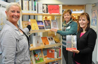 Die Stadtbibliothek Bocholt hat ihr Angebot erweitert. Die Mitarbeiterinnen präsentieren die Bücher in arabischer Sprache, die ab sofort ausgeliehen werden können - Foto: Bruno Wansing, Stadt Bocholt