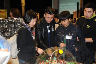 Chinesen betrachten ein Architekturmodell, welches Schülerinnen und Schüler zum Thema "Wohnsituation in Bocholt im Jahr 2030" gestalteten. (Foto: Stadt Bocholt)