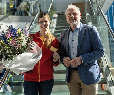 André Decker (rechts) erhielt nach der Premiere seiner aktuellen Inszenierung "Present Laughter" die Ehrennadel der Kreisstadt Unna, überreicht vom Ersten Beigeordneten Sandro Wiggerich (links).