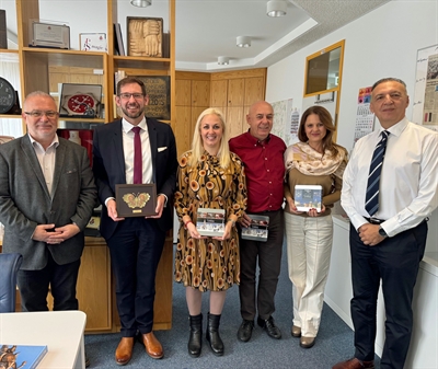 Der Erste Beigeordnete Sandro Wiggerich (2.v.l.) empfing Goran Angelov (l.), Direktor der staatlichen Agentur für Auswanderung der Republik Nordmazedonien, sowie Ana Petrovska (Mazedonischer Kulturverein Makedonija e.V. Unna), Jone Nicovski (1. Vorsitzender Makedonija), Biljana Kostova und Igor Tanturovski (beide Agentur für Auswanderung) im Rathaus, um dem Kulturverein zum 30-jährigen Bestehen zu gratulieren.