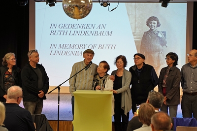 Manfred Lindenbaum (Mitte, mit seiner Frau Annabel im Arm) steht im Kreise seiner Familie in der Aula des Bildungszentrums Am Hertinger Tor. Insgesamt 26 Angehörige und Freunde haben den 93-jährigen Bruder von Ruth Lindenbaum aus den USA zu der Feier nach Unna begleitet.