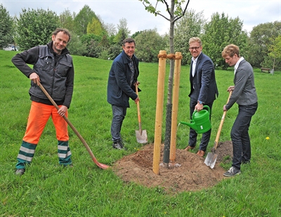 Annette Meyering von der Firma Hund Energietechnik legte gemeinsam mit Stadtbaurat Daniel Zöhler, Peter Schlabs und Gisbert Buyting (v.r.n.l.) vom Fachbereich Tiefbau, Verkehr und Stadtgrün bei der Pflanzung des Jahresbaumes kräftig Hand an.