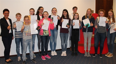 Die stv. Bürgermeisterin Elisabeth Kroesen (links) zeichnet die 12 Gewinner des Lesewettbewerbs der Deutsch-Französischen Gesellschaft Bocholt e.V. am 11. April 2018 in der Stadtsparkasse Bocholt aus - im Hintergrund rechts: DFG-Organisatorin Hilke Smidt