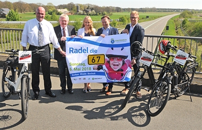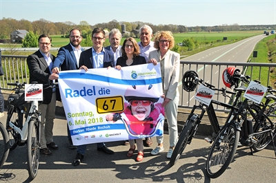 Autofreie B67! Dafür sorgen am 6. Mai von 11 - 17 Uhr (v.l.n.r.) Rhedes Bürgermeister Jürgen Bernsmann, Bocholts Bürgermeister Peter Nebelo, Borkens Bürgermeisterin Mechtild Schulze Hessing, Landrat Kai Zwicker und Bocholts Stadtbaurat Daniel Zöhler