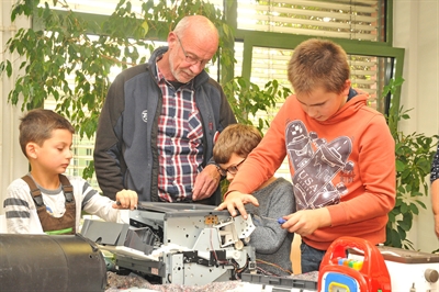 Interessiert und gebannt verfolgen die "Forscherfüchse" des Euregio-Gymnasiums die Ausführung von Hans-Karl Eder von der Jungen Uni in Bocholt - Foto: Bruno Wansing, Stadt Bocholt