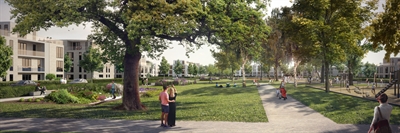 Vision für die gar nicht allzu ferne Zukunft: Oberbürgermeister Wolfgang Griesert sieht sich an, wie der Jugendtreff Kompass am Heinz Fitschen Haus nach seiner Fertigstellung im Sommer 2021 aussehen soll.