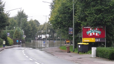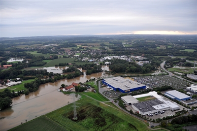 Hochwasser der Düte im Jahr 2010, hier im Bereich von IKEA im Stadtteil Hellern: Überschwemmungsgebiete sind keine behördliche, veränderbare Planung, sondern bilden eine von Natur aus bestehende Hochwassergefahr ab.