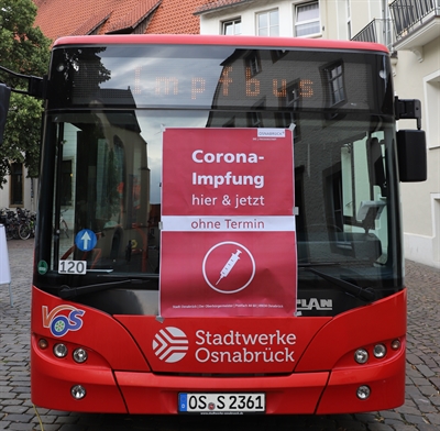 Darüber, dass der Impfbus gut angenommen wird, freuen sich (von links) Stadträtin Katharina Pötter, Kai Müller, Dienststellenleiter der Johanniter-Unfall-Hilfe Osnabrück, und Christoph Hüls, Vorstandsvorsitzender der Stadtwerke Osnabrück.