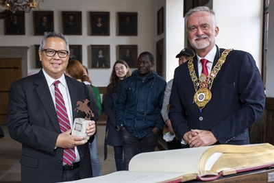 Nachdem sich der Indonesische Generalkonsul Ardian Wicaksono (links) ins Goldene Buch der Stadt Osnabrück eingetragen hat, überreichte Oberbürgermeister Wolfgang Griesert ihm als Geschenk den Friedensreiter.