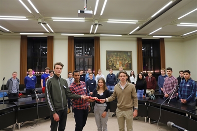 Julius Walkenhorst (vorne rechts), Vorsitzender des Vorstands des alten Jugendparlaments, übergibt den Staffelstab an (von links) Richard Timmermeister, Noah Wallenstein und Jamila-Lia Fey Usselmann sowie deren Kolleginnen und Kollegen im neuen Jugendparlament.