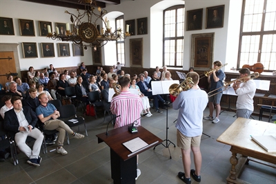 Im vollen Friedenssaal des Rathauses singen die Sängerinnen von „Herzensstimmen“, dem Chor der Musik- und Kunstschule, passend zum Anlass „Thank you for the Music“ von ABBA.