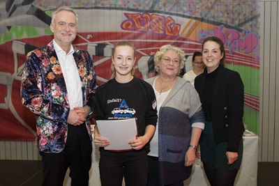 Basketballerin Lilly Rüße (2. v. links) vom BBC Osnabrücker erhielt gleich zwei Ehrungen in Gold, einmal für die Teilnahme an einem internationalen Pokalturnier in Frankreich mit der Deutschen U15-Nationalmannschaft und einmal für den ersten Platz beim Bundesentscheid „Jugend trainiert für Olympia“ im Basketball mit dem Team des Ratsgymnasiums Osnabrück. Ihr gratulieren (von links) Oberbürgermeister Wolfgang Griesert, Petra Knabenschuh, stellvertretende Vorsitzende des Schul- und Sportausschusses, und Melanie Müller von der Sportjugend des Stadtsportbundes.