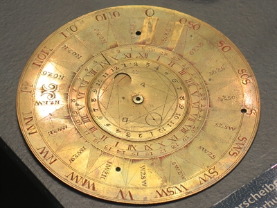Kalenderscheibe mit Sternenuhr aus dem 16. Jahrhundert, mit der sich beispielsweise die Mondphasen und die beweglichen Feiertage eines Jahres berechnen ließen. Diese Scheibe aus der Sammlung der Wilhelm-Karmann-Stiftung ist in der neuen Dauerausstellung im Museum am Schölerberg zu sehen.