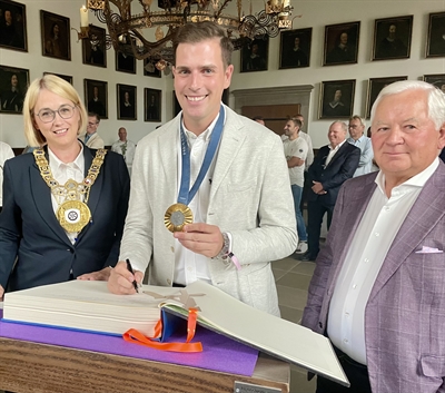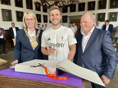 Nachdem sich der Indonesische Generalkonsul Ardian Wicaksono (links) ins Goldene Buch der Stadt Osnabrück eingetragen hat, überreichte Oberbürgermeister Wolfgang Griesert ihm als Geschenk den Friedensreiter.