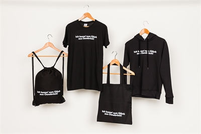 Die Glücks-T-Shirts, Hoodies und Rucksackbeutel in schwarz sind im Rahmen einer Sommeraktion zu vergünstigten Preisen in der Tourist Information erhältlich.