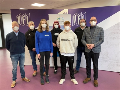 Demokratieverständnis, Toleranz und Vielfalt sind Werte, welche durch das Klassenzimmer „Lernort Bremer Brücke“ vermittelt und gefördert werden. (v.r.) Erster Stadtrat Wolfgang Beckermann, Dr. Michael Welling (Geschäftsführer des VfL Osnabrück), Projektteilnehmer Fynn Thole (Gymnasium Bersenbrück), Tina Schröter vom Fanprojekt, Projektteilnehmerin Johanna Lohbeck (Gymnasium Bersenbrück), Fredy Engel von der Fanabteilung sowie Freddy Fenkes, VfL Museum.