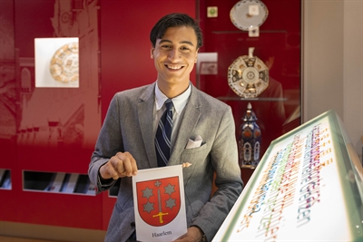 Laura Wodny und Oberbürgermeisterin Katharina Pötter präsentieren im Friedenssaal des Rathauses den Siegerentwurf im Original sowie die frisch gedruckte Karte.