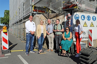 Baken, die Geräusche machen, um blinde- und sehbeeinträchtigte Menschen sicher durch Baustellen zu führen, gibt es jetzt am Neumarkt. Vorgestellt haben das System (von links) Rudolf Broer von RTB, Oberbürgermeisterin Katharina Pötter, Gerhard Renzel vom Blinden- und Sehbehindertenverband Deutschland, Steven Brentrop von der städtischen Fachstelle Inklusion, Petra Mathiske vom Osnabrücker Behindertenforum und Lena Kley von Fabema.