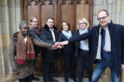 Ein Foto, das vor Beginn des Projektes und vor der Corona-Pandemie entstanden ist: Sie alle eint das Ziel, Hemmschwellen abzubauen und Menschen mit Migrationshintergrund den Weg in die Kommunalpolitik zu ebnen: (von links) Helen Nintemann, Maren Wilmes und Vëllaznim Haziri vom Migrationsbeirat sowie die Ratsvorsitzende Rita Feldkamp, Sozialvorstand Katharina Pötter und Ralf Sabelhaus vom städtischen Fachdienst Integration.