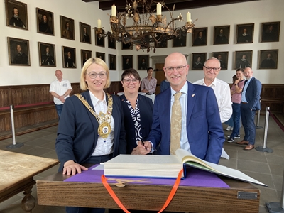 S.E. Christoph Eichhorn, Deutscher Botschafter in Tallinn trug sich ins Goldene Buch der Stadt Osnabrück ein. Oberbürgermeister Wolfgang Griesert erläuterte die Geschichte des Westfälischen Friedens.