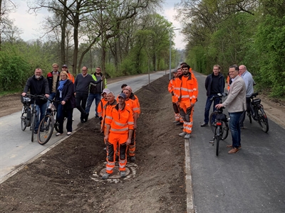 Planen, koordinieren, umsetzen: Bei einem Projekt wie dem Radweg Am Limberg sind viele Fachleute gefragt. Sie haben nun gemeinsam die Einweihung gefeiert. Das Foto zeigt sie am höchsten Punkt des Weges, der im Hintergrund steil bergab in Richtung Innenstadt führt.