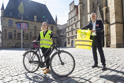 Oberbürgermeister Wolfgang Griesert präsentiert die neue Sicherheitsweste mit der Aufschrift „Mit Abstand besser“ für Radfahrer. Janin Arntzen vom Referat für Medien und Öffentlichkeitsarbeit hat für die Kampagne „Mit Abstand besser“ das Design erstellt.