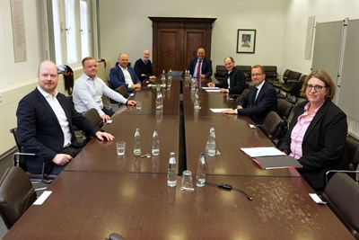 Hanspeter Teetzmann, Geschäftsführer der Stiftung Opferhilfe Niedersachsen, Staatssekretär Dr. Frank-Thomas Hett, Oberbürgermeister Wolfgang Griesert und Dr. Michael Schmitz, Regionaler Vorstandsvorsitzender der Stiftung Opferhilfe Niedersachsen nahmen an der hybriden Tagung zum Thema „Häusliche Gewalt“ im Ratssitzungssaal teil.