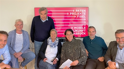 Haben die neuen Patenprojekte des Projektes Mobile Zukunft vorgestellt: (v.r.) Marco Hörmeyer (Stadtwerke Osnabrück), Annette Harding, Thomas Haarmann, Susanne Hambürger dos Reis, Brigitte Strathmann (Stadt Osnabrück), Malte Wanzek (Stadt Osnabrück), Markus Pörtner (Verein für Baukultur e.V.).