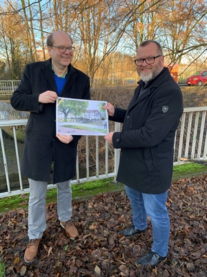 Hier soll die neue Brücke entstehen und wie sie aussehen könnte zeigen der Niedersächsische Umweltminister Christian Meyer (links) und Mike Bohne, Leiter des Fachbereichs Geodaten und Verkehrsanlagen.