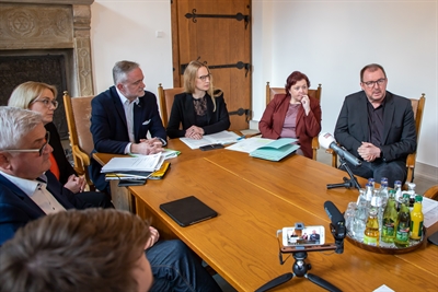 Hanspeter Teetzmann, Geschäftsführer der Stiftung Opferhilfe Niedersachsen, Staatssekretär Dr. Frank-Thomas Hett, Oberbürgermeister Wolfgang Griesert und Dr. Michael Schmitz, Regionaler Vorstandsvorsitzender der Stiftung Opferhilfe Niedersachsen nahmen an der hybriden Tagung zum Thema „Häusliche Gewalt“ im Ratssitzungssaal teil.