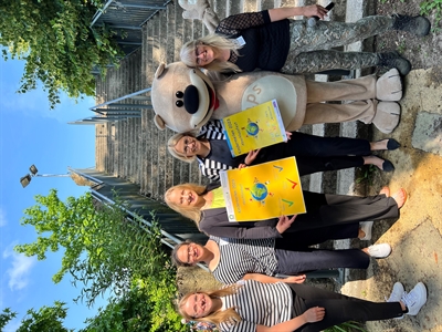 (v.l.): Christina Hippen und Verena Borgers (Landkreis Osnabrück), Landrätin Anna Kebschull, Oberbürgermeisterin Katharina Pötter und Birigit Rademacher (Stadt Osnabrück) übergaben die Urkunden zur Kindermeilen-Aktion gemeinsam mit Maskottchen Taps an die teilnehmenden Schulen und Kindergärten.