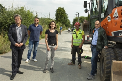 (von links) Stadtbaurat Frank Otte, Daniel Wörder (IPW), Nicola Fiedler (Stadt Osnabrück), Daniel Tiemann (Dieckmann) und Hartmut Dieckmann (Dieckmann Bauen+Umwelt) planen, den zweiten Abschnitt des Radschnellweges im Juni 2022 eröffnen zu können.