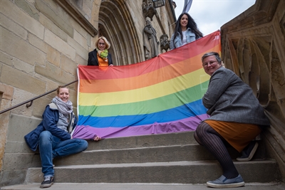 Oberbürgermeisterin Katharina Pötter (oben links), Heba Najdi vom Antidiskriminierungsbüro der Stadt Osnabrück (oben rechts), Ann Kristin Schneider, stellvertretende Gleichstellungsbeauftragte und Patricia Heller, Gleichstellungsbauftragte, mit der Regenbogenflagge, die am Dienstag, 17. Mai, an der Stadtbibliothek weht.