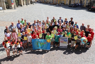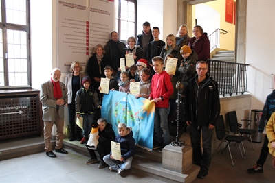 Oberbürgermeister Wolfgang Griesert, Stadtbaurat Frank Otte und die Bürgermeisterin Eva-Maria Westermann im Friedenssaal mit den Jungen und Mädchen, die an der Aktion „Kindermeilen" teilgenommen haben